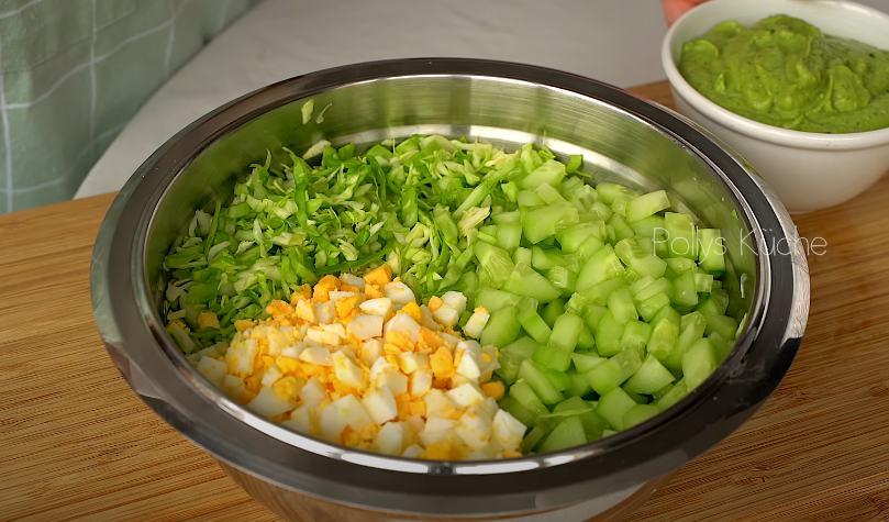 • Do miski dodaj kapustę, ogórek, jajka, awokado i pietruszkę.