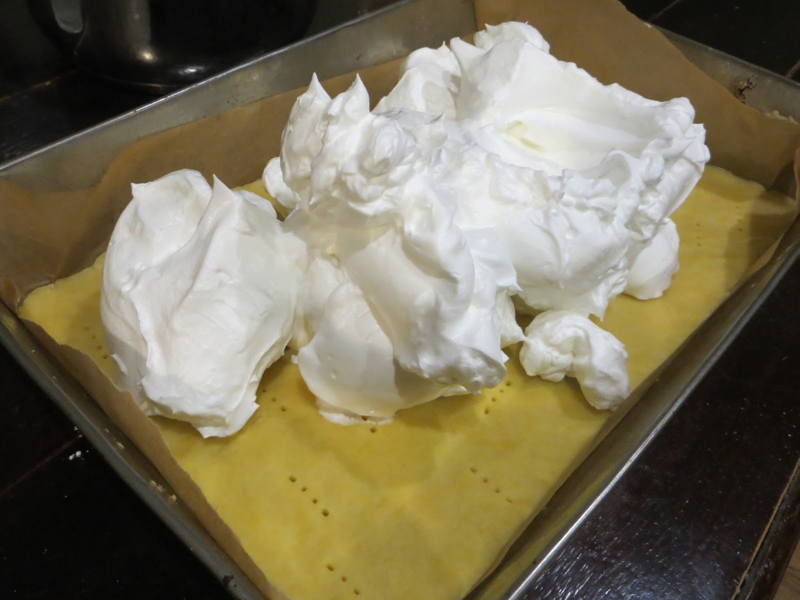 Białka trzeba ubić na sztywno wraz z cukrem pudrem. Potem wyłożyć je na blachę, na której znajduje się rozłożone kruche ciasto.