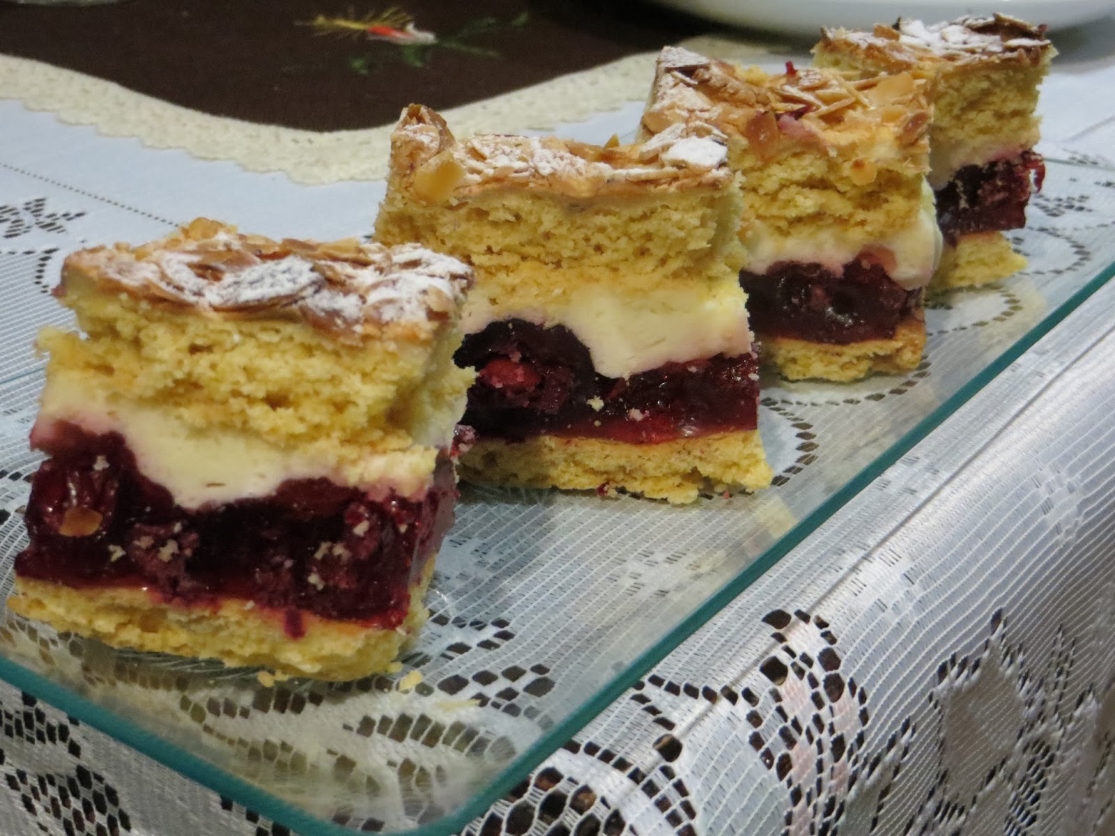 Kruche ciasto z galaretką wykonaną na bazie soku oraz mrożonych wiśnie i połączenie jej z śmietankową pianką oraz chrupkami migdałowymi gwarantuje niezapomniany smak!