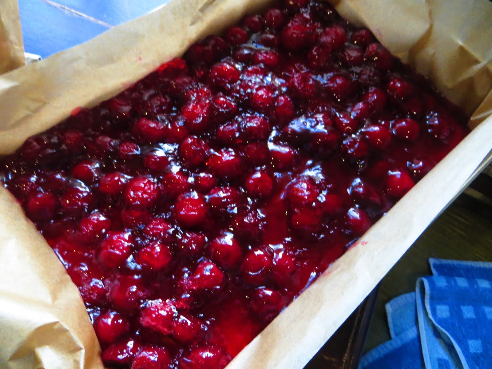 Jeszcze do płynnej galaretki trzeba wsypać mrożone wiśnie i całość dokładnie wymieszać. Masa szybko stężeje, więc należy w odpowiednim momencie wylać ją na ostudzone kruche ciasto.