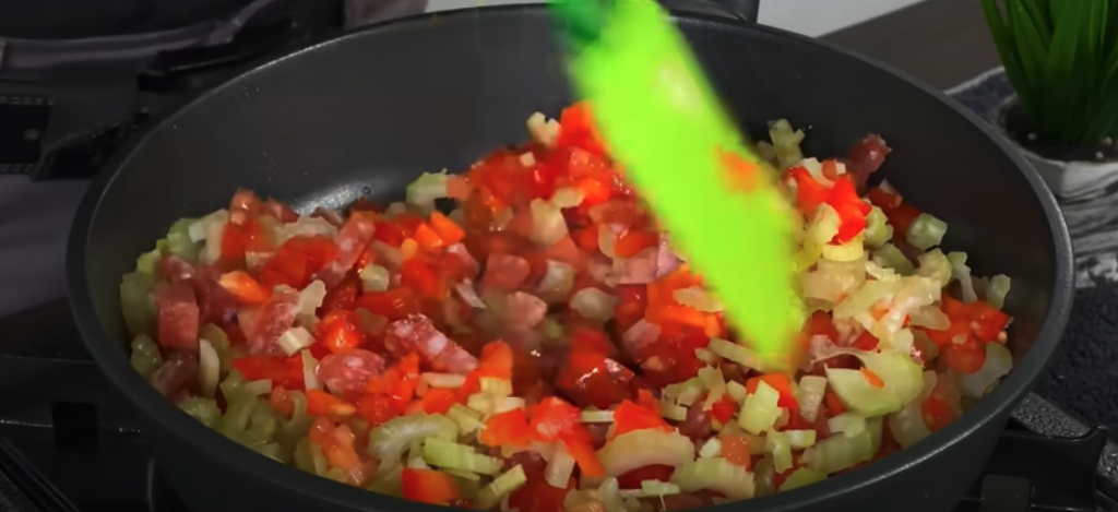 Obierz i pokrój 3 duże ziemniaki na kawałki. Włóż ziemniaki do miski i wymieszaj z 2 jajkami, solą, mielonym czarnym pieprzem, papryką i bułką tartą. Rozłóż ziemniaki na blaszce wyłożonej papierem do pieczenia. Wstaw do piekarnika nagrzanego do 200°C na 25 minut. Pamiętaj, aby dostosować czas pieczenia do cech swojego piekarnika. Pokrój 1/2 słodkiej czerwonej papryki, 1 pomidora, seler i 150 g kiełbasy salami na małe kawałki.