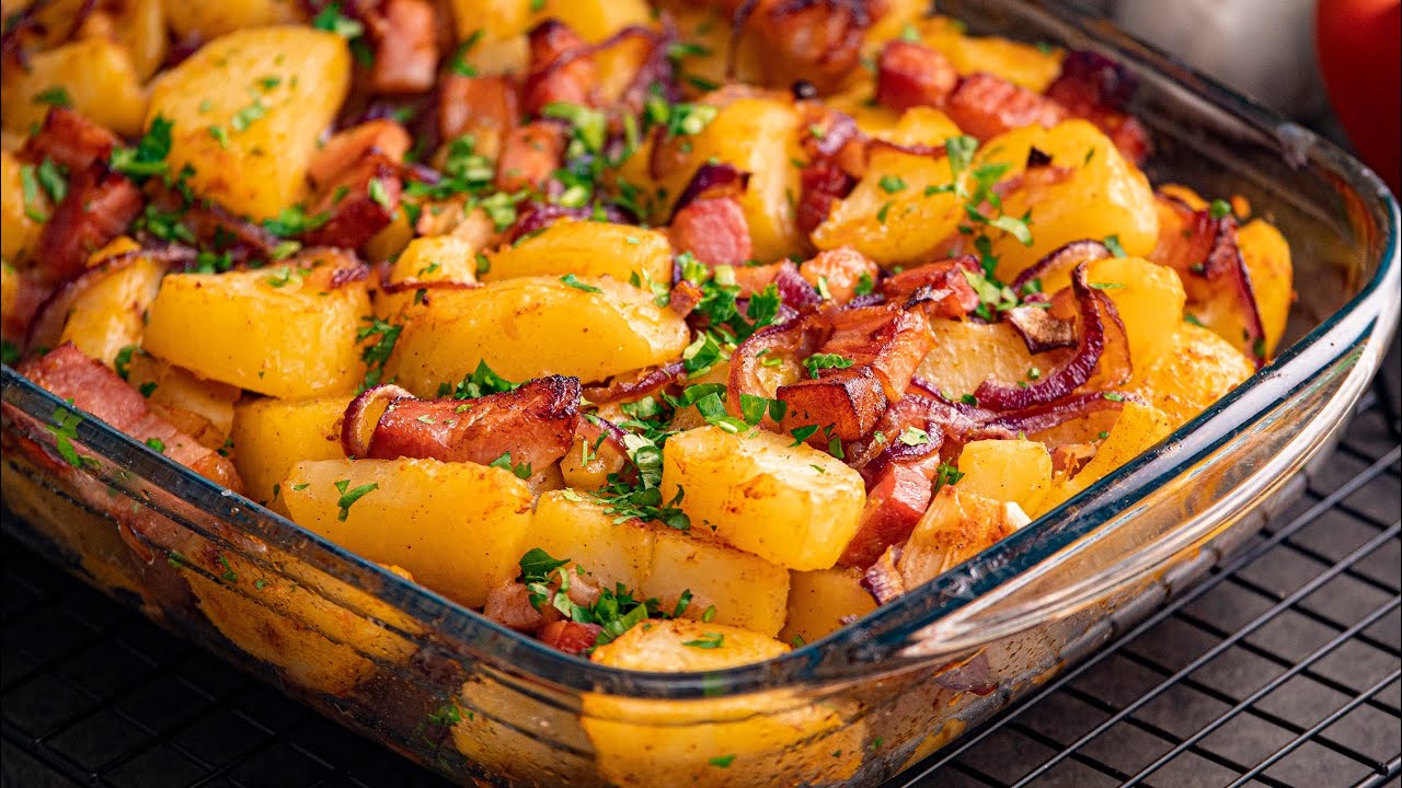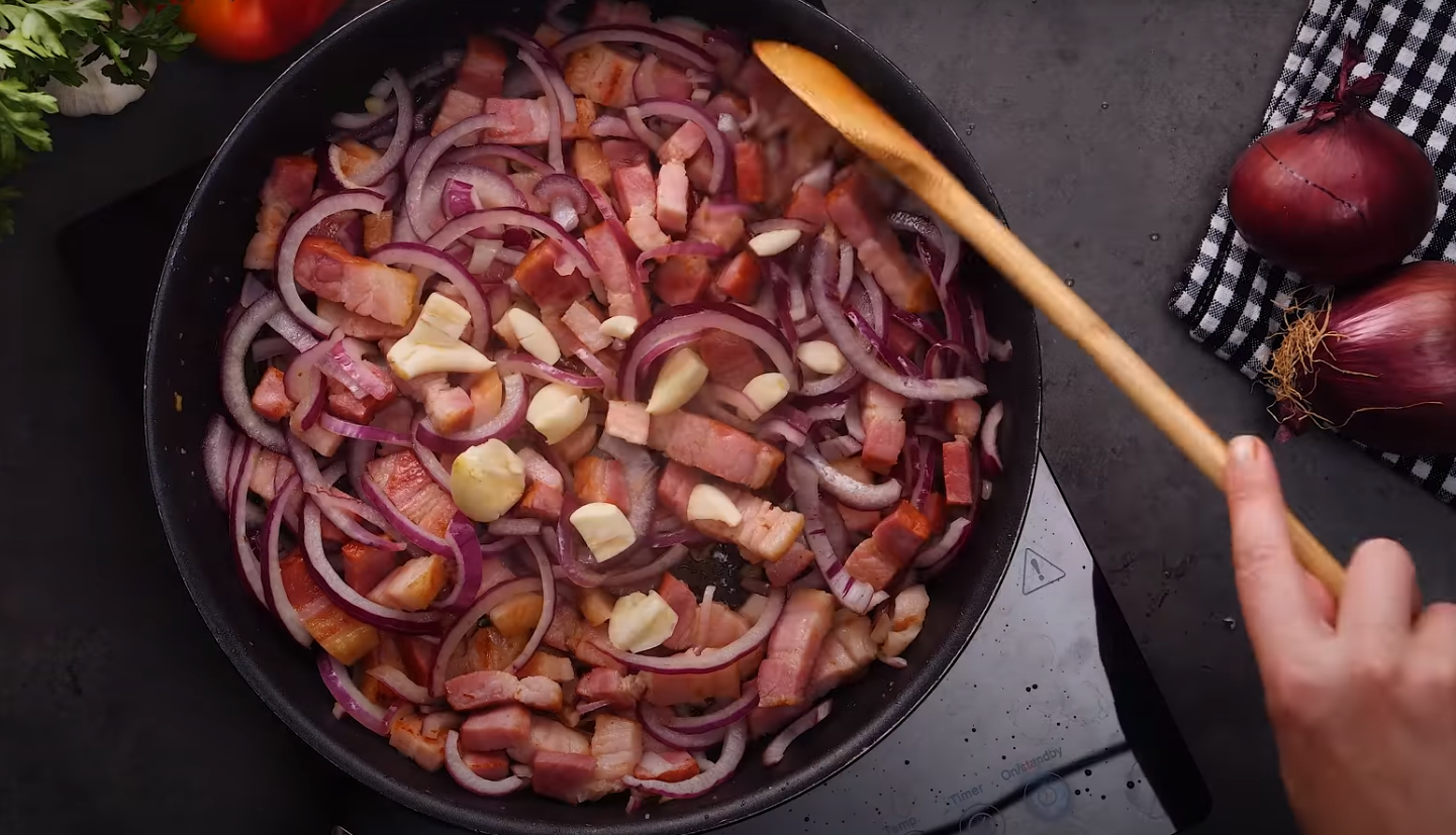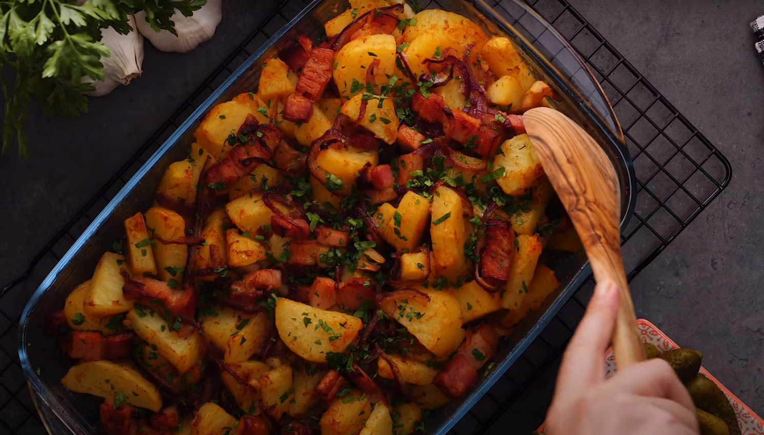 Posól czosnek i podsmaż go razem. Pokroić czosnek na cienkie plasterki. Wymieszaj posiekany czosnek z cebulą i boczkiem. Przygotuj naczynie do zapiekania (np. Umieść ziemniaki w naczyniu do zapiekania (np. brytfannie lub naczyniu żaroodpornym). Posyp ziemniaki przyprawami, a następnie wyłóż na nie zawartość patelni.
