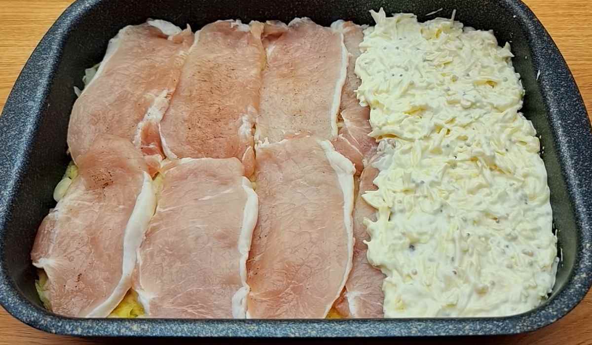 Rozłóż powstały sos równomiernie na wierzchniej warstwie naczynia. Naczynie przykryj pergaminem i folią i piecz w 180 stopniach przez około 20 minut.