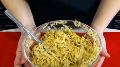 Obrane ziemniaki zetrzyj na tarce i wyciśnij jak najwięcej soku, który wylej z miski. Następnie ziemniaki wymieszać z jajkami, tartym serem, posiekanym koperkiem oraz solą i pieprzem wszystkie składniki.