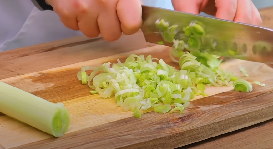 - Drobno posiekaj cebulę, seler, por, marchewkę, czerwoną paprykę i ziemniaki.