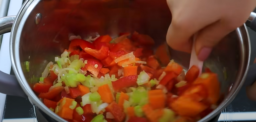 - Dodaj posiekaną cebulę, seler, por, marchewkę, czerwoną paprykę i ziemniaki. Smaż na średnim ogniu, aż warzywa będą miękkie.