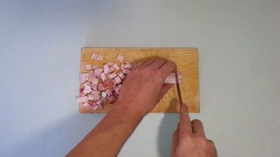 Obierz marchewkę i cebulę. Marchewkę pokroić w drobną kostkę, a cebulę drobno posiekać. Następnie boczek angielski pokroić w mniejszą kostkę.
