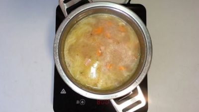 Do garnka wlać olej i pozostawić na nim cebulę do zeszklenia. Następnie dodajemy do tego marchewkę z boczkiem angielskim i chwilę smażymy. Dzień wcześniej namoczoną i odsączoną soczewicę wlać do garnka i wszystko dokładnie wymieszać. Następnie zalać bulionem lub wodą.